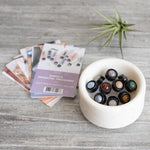 Тези ръчно изработени ролер накрайници от скъпоценни камъни са идеалният аксесоар към вашата персонализирана колекция от етерични масла. Когато скъпоценните камъни и етеричните масла се комбинират с личното енергийно поле на потребителя, те се хармонизират и синхронизират, за да повишат честотата на тялото до нива, които могат да имат лечебни и уелнес ползи. Високите енергийни честоти са идеалната основа за тялото да се предпази от неразположения и заболявания. Заедно с ролер накрайниците, този комплект включва индивидуални карти с инструкции, по една за всеки скъпоценен камък, описващи уелнес и емоционалите им ползи, когато си използват с етерични масла.