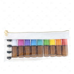 Съдържание: 9 х 5 мл. амбър стъклени ролон бутилки, първокласни неръждаеми ролери и пластмасови многоцветни капачки с прозрачен несесер с цип.