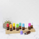Тези възхитителни многоцветни бутилки от амбър стъкло в НОВ ДИЗАЙН от 5 мл. с първокласни ролки от неръждаема стомана и пластмасови многоцветни капачки са чудесни за вашите любими етерични масла и блендове. Предлагат се в прозрачен несесер за пътуване с цип, идеален за демонстрация и за носене навсякъде, където и да отивате. Тези бутилки могат да станат още по-красиви, ако ги украсите с нашите Чакра етикети, както и с комплект Направи си сам от серията Chakra MyMake.