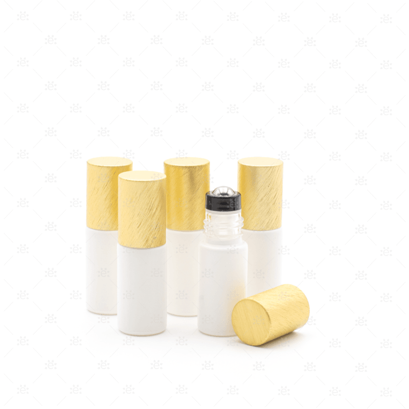 Deluxe матирани 5 мл. бели ролон бутилки със златисти метални капачки & премиум ролери (5 бр.)