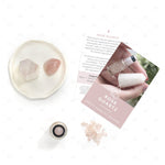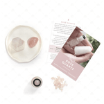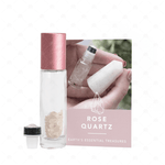 Заедно с ролера със скъпоценен камък Розов кварц, този комплект включва и прозрачна ролон бутилка от 10 мл., завършена с първокласна алуминиева капачка. Приблизително 1/3 от ролон бутилката е пълна с малки скъпоценни камъни от Розов кварц. Този комплект е придружен от индивидуална карта с инструкции, описваща уелнес и емоционалните ползи, които този скъпоценен камък може да предложи и етеричните масла, които ще допълнят употребата му.